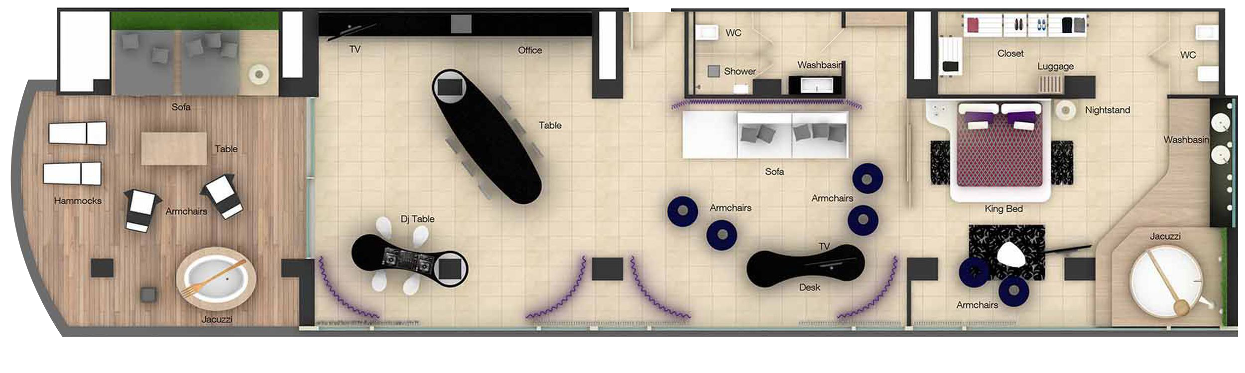 Neid weckt Begehrlichkeiten … deshalb wollen alle VIPs die I'm On Top of the World Suite im The Unexpected Ibiza Hotel – diese aufregendste Suite von ganz Ibiza ist so nah am Usuahïa, dass Sie die Beats spüren können. Das Unerwartete ist hier normal. 214 m², ausgestattet mit allem, was Sie sich vorstellen: Konferenzzimmer, Ankleidebereich, Whirlpool-Badewanne auf der Terrasse und eine weitere im Wohnzimmer, zwei Badezimmer und ein Wohnbereich mit 52-Zoll-Flachbildfernseher und DJM 2000 Mischpult. Alles umrahmt vom atemberaubenden Blick auf das Meer.