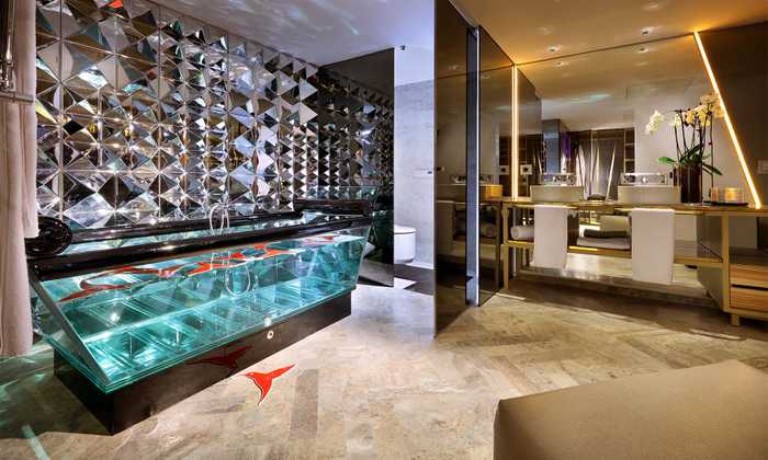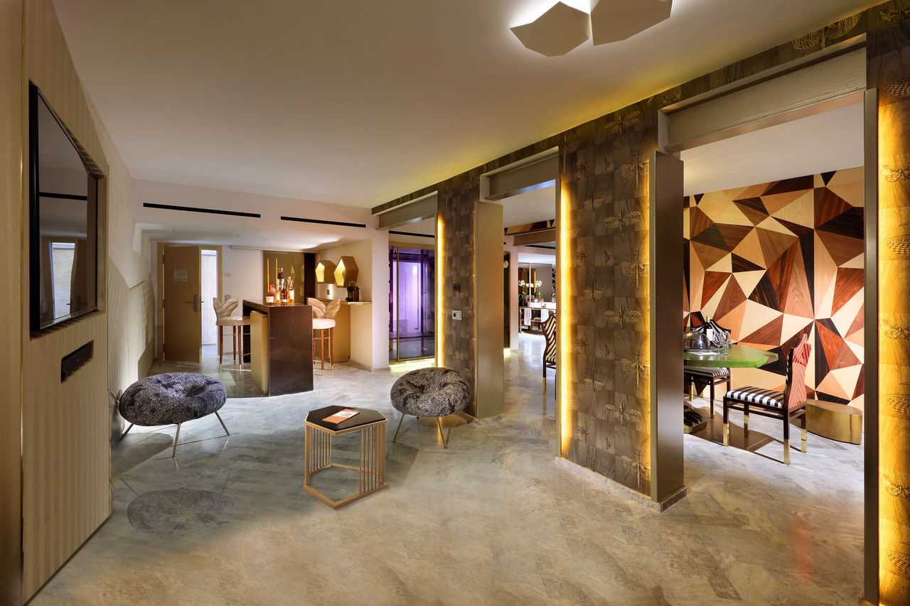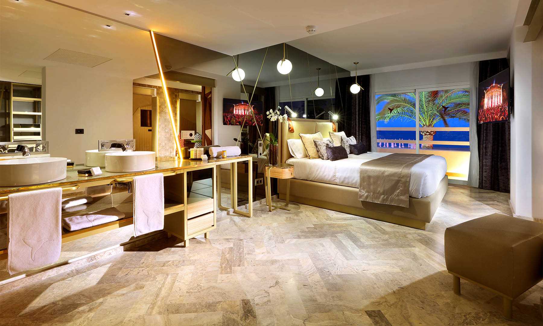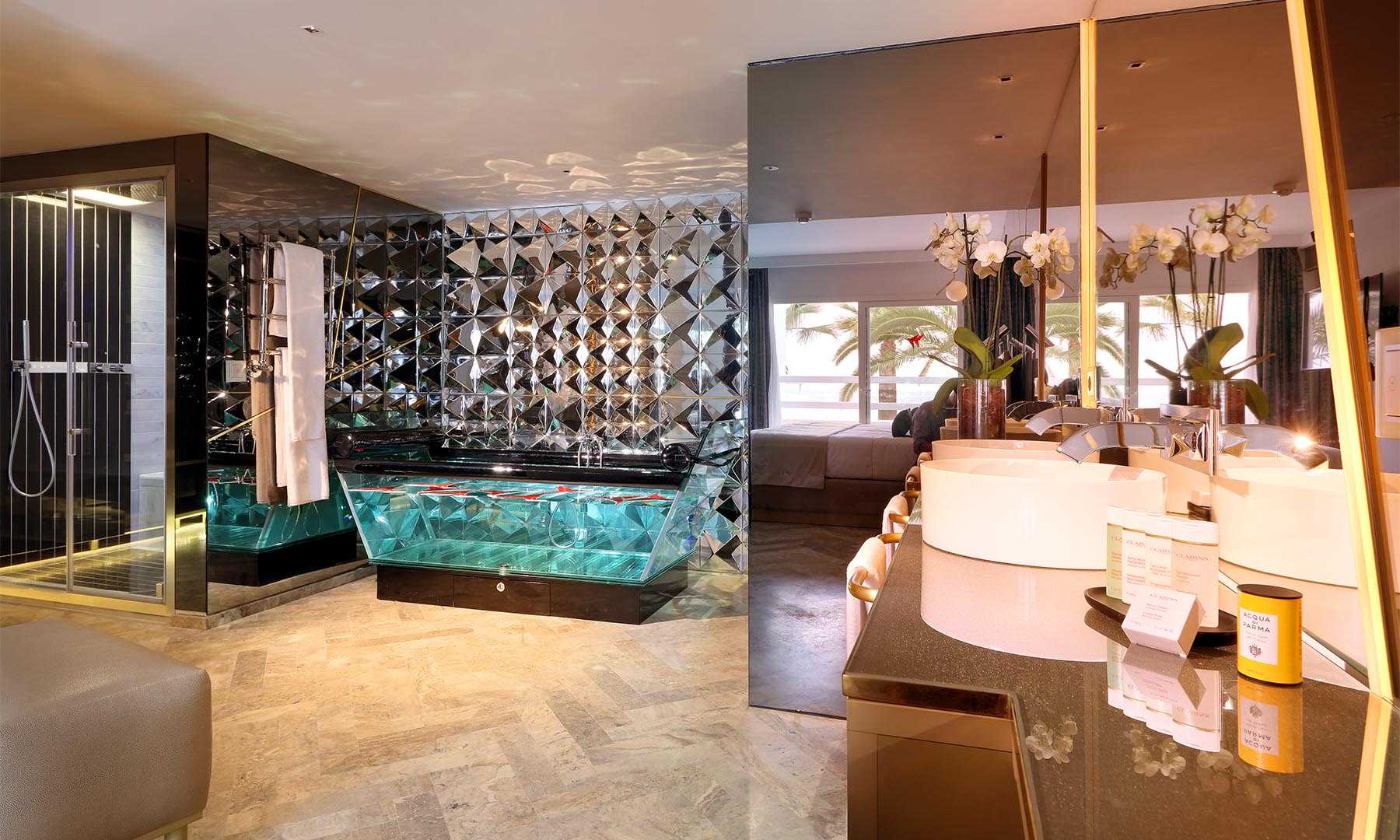 Ein spätes Frühstück auf der Terrasse mit Kaviar und Lachs. Und Austern bei Sonnenuntergang. Und Sushi in der Nacht. Du willst die beste Aussicht auf das Meer, nur für Dich. Verweile den ganzen Morgen auf der Terrasse. Geh vom Bett zum Hamam und vom Hamam zu einer spektakulären transparenten Badewanne und von dort zum Bett und von dort zur Terrasse. Solange, bis die Party beginnt. Genuss pur. Faul sein. Lust. Und Neid: nicht haben, sondern verursachen. Unendlich viele Selfies. Auf der 100 m2 großen Fläche der luxuriösen Oh My God Suite erwarten Dich viele Freuden. Genieße sie.