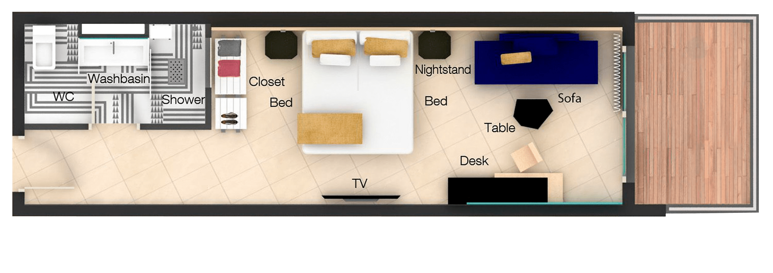 39,25,Две отдельные кровати (100 см каждая) с возможностью превратить их в одну двуспальную кровать (по запросу).